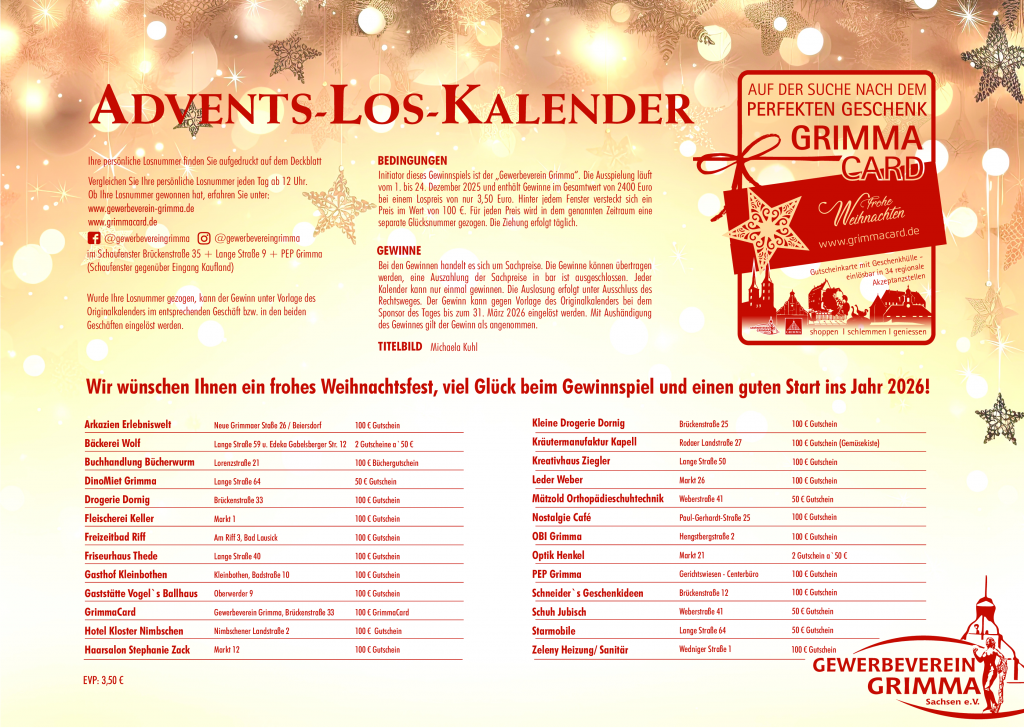 Auch in diesem Jahr bringt der Gewerbeverein Grimma mit dem beliebten Advents-Los-Kalender festliche Spannung in die Vorweihnachtszeit. Hinter jedem Türchen wartet ein attraktiver Sachpreis im Wert von 100 € – insgesamt verlosen wir Gewinne im Gesamtwert von 2.400 €!